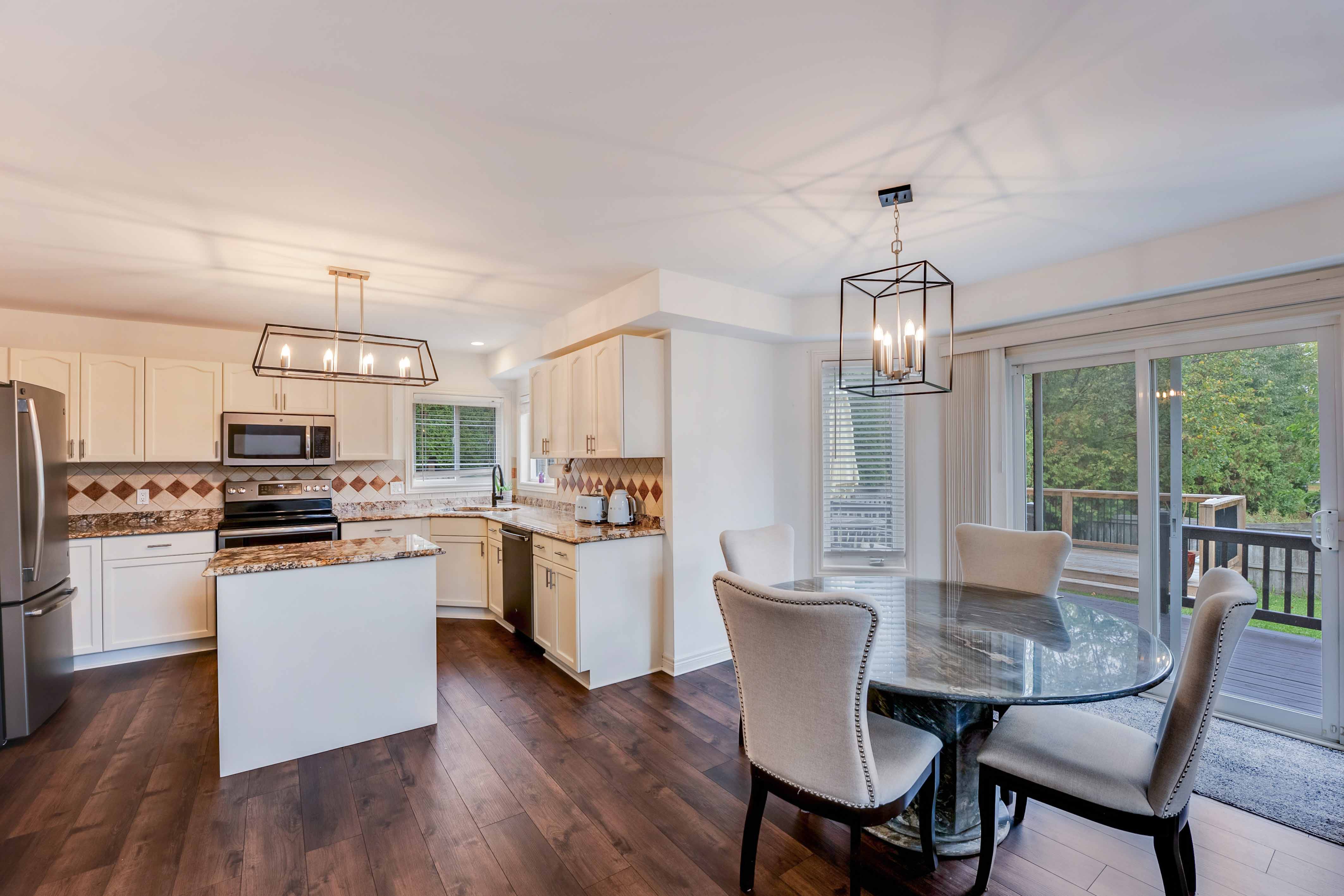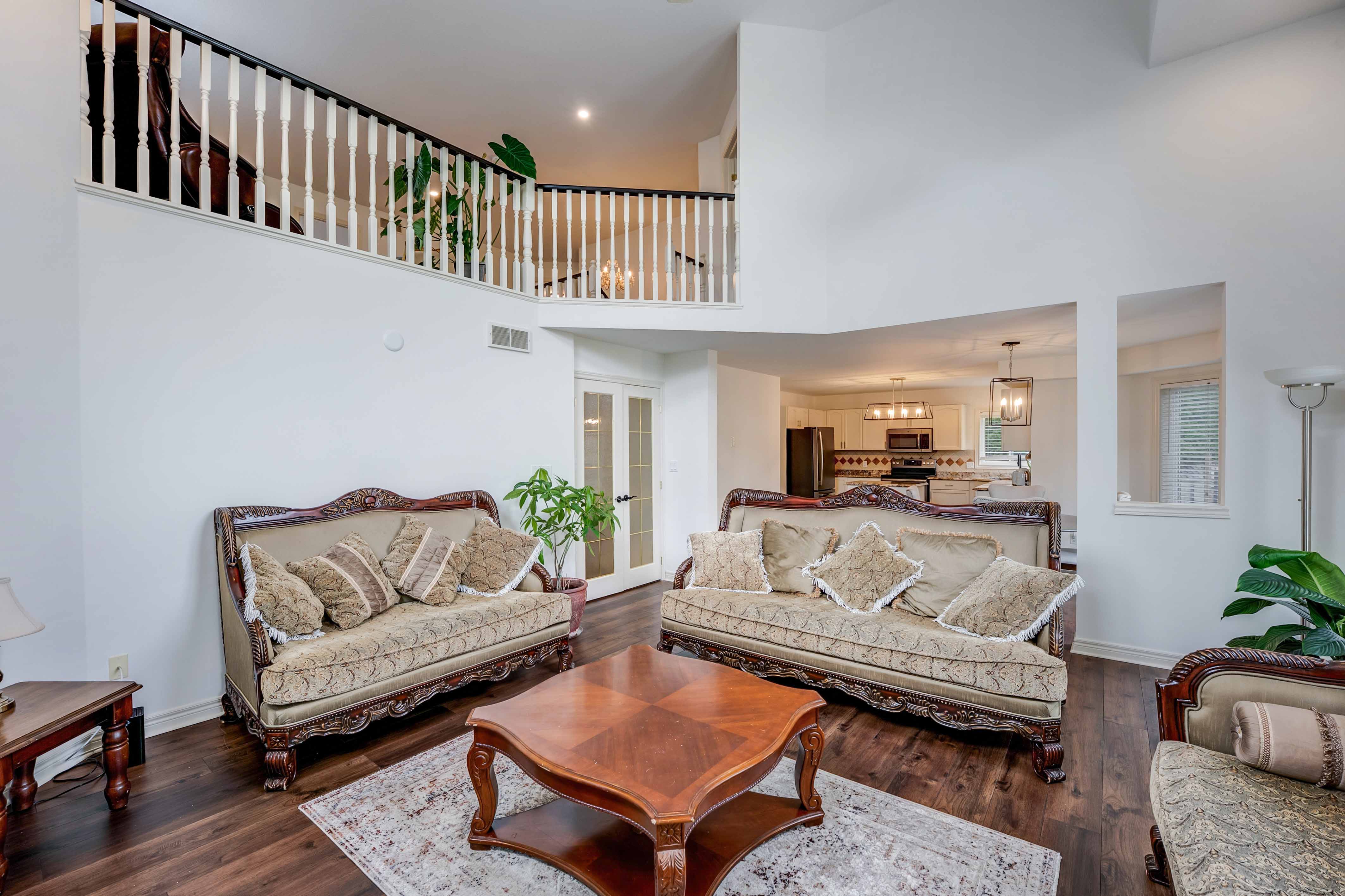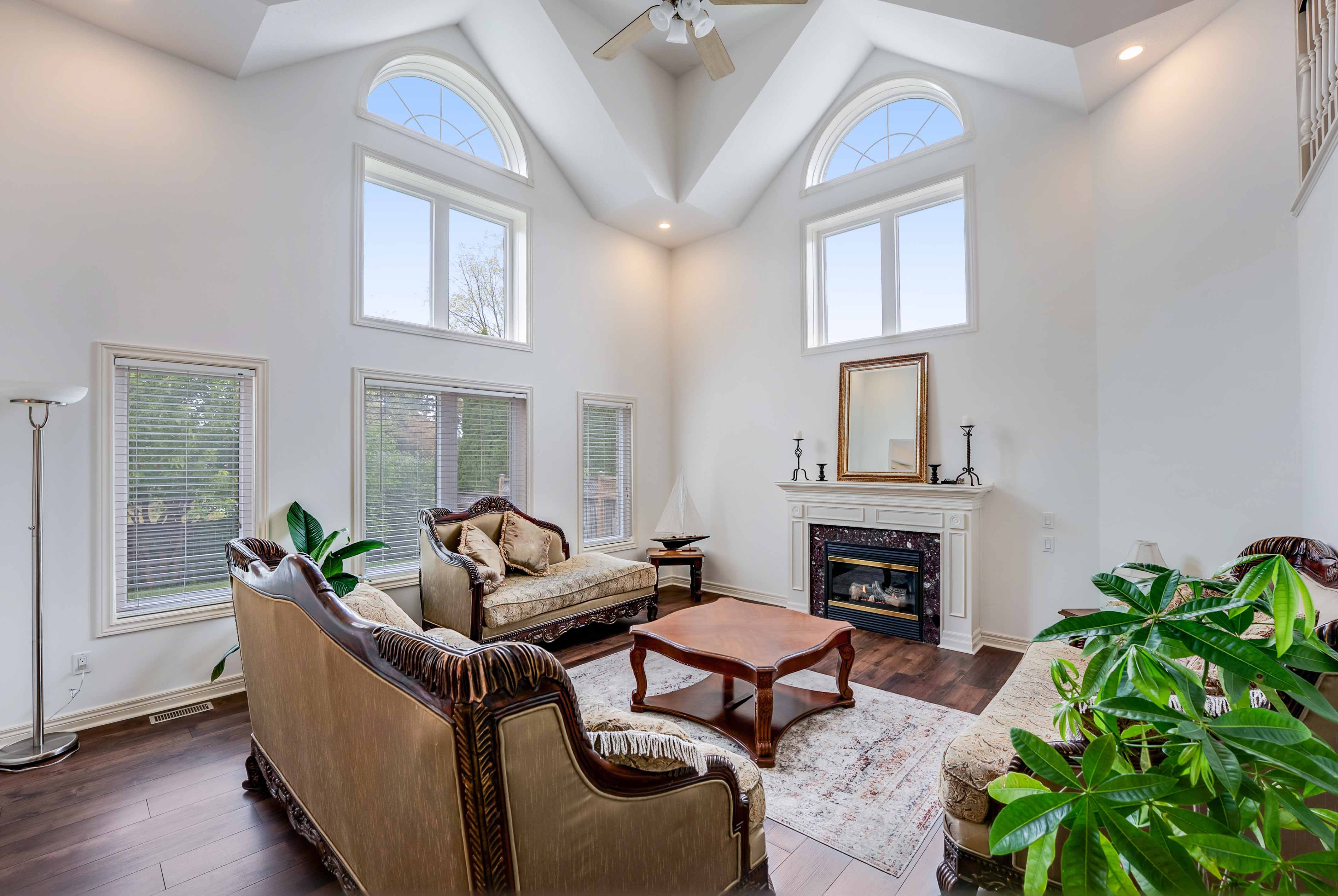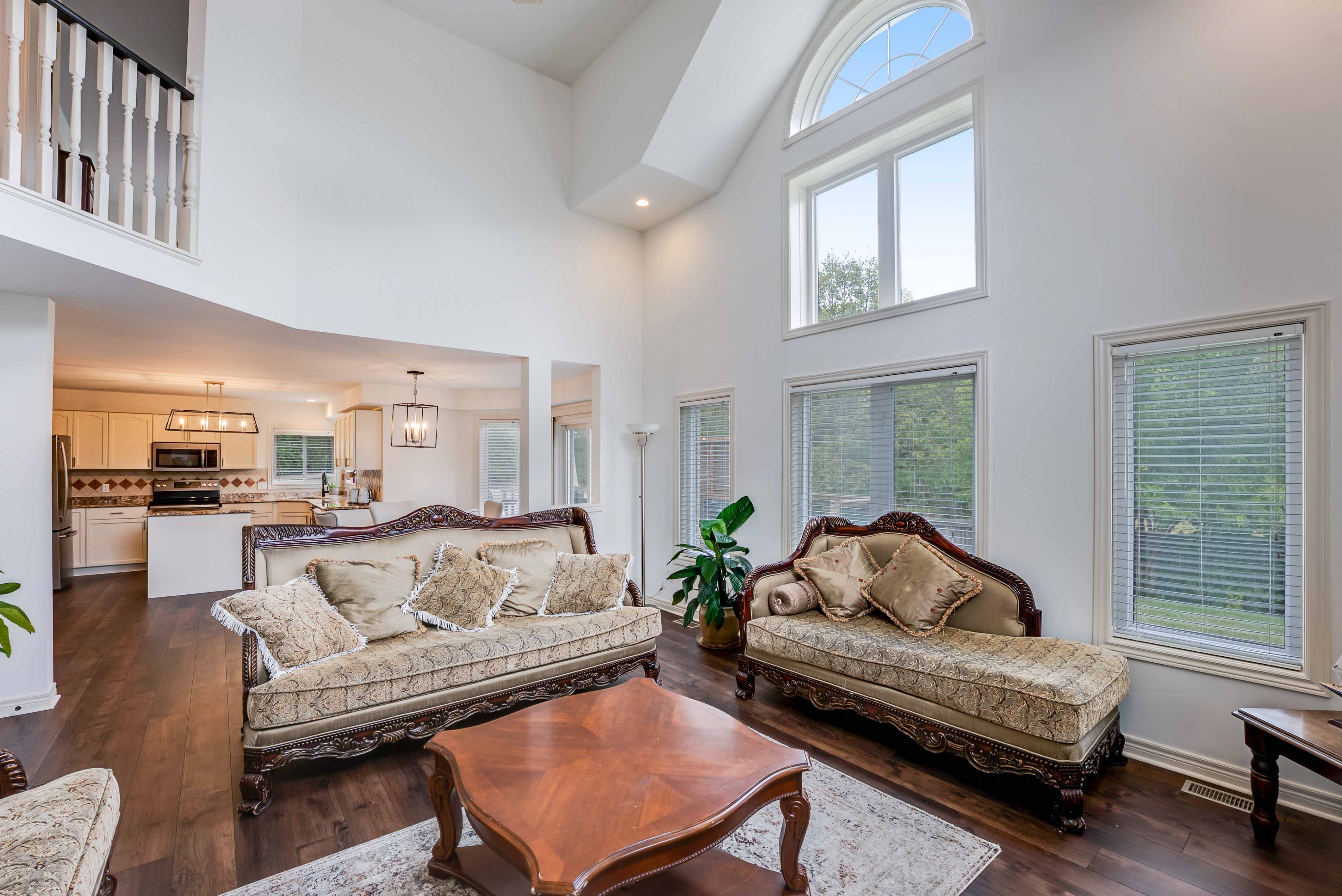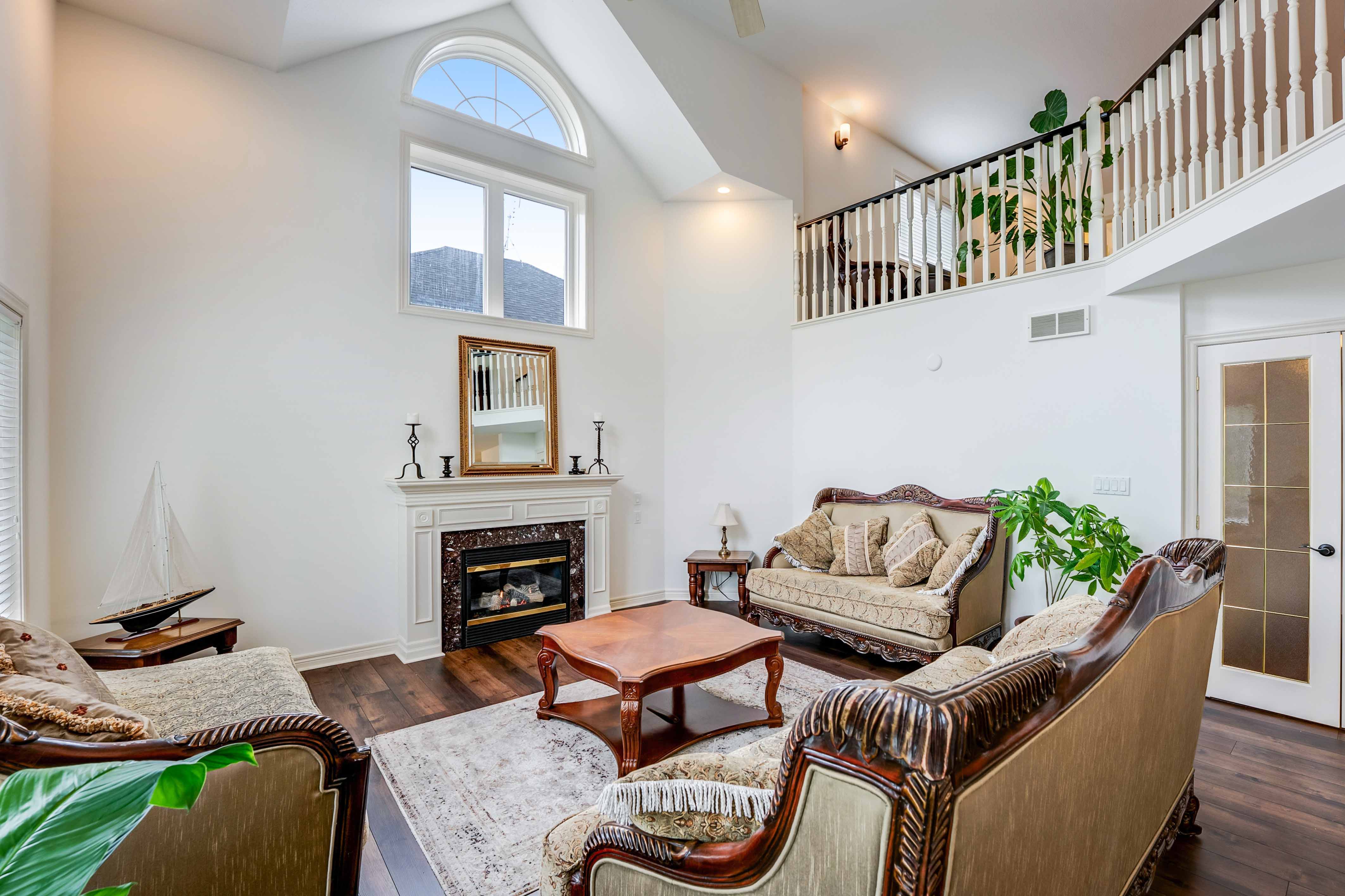 Step inside to a soaring 2-storey great room, now showcasing gleaming new flooring, LED pot lights, and a dramatic fireplace wall framed by oversized windows filling the space with light and elegance. The freshly updated kitchen is both functional and refined, featuring stone countertops, stainless steel appliances, and a brand-new walk-in pantry for added storage and organization.
